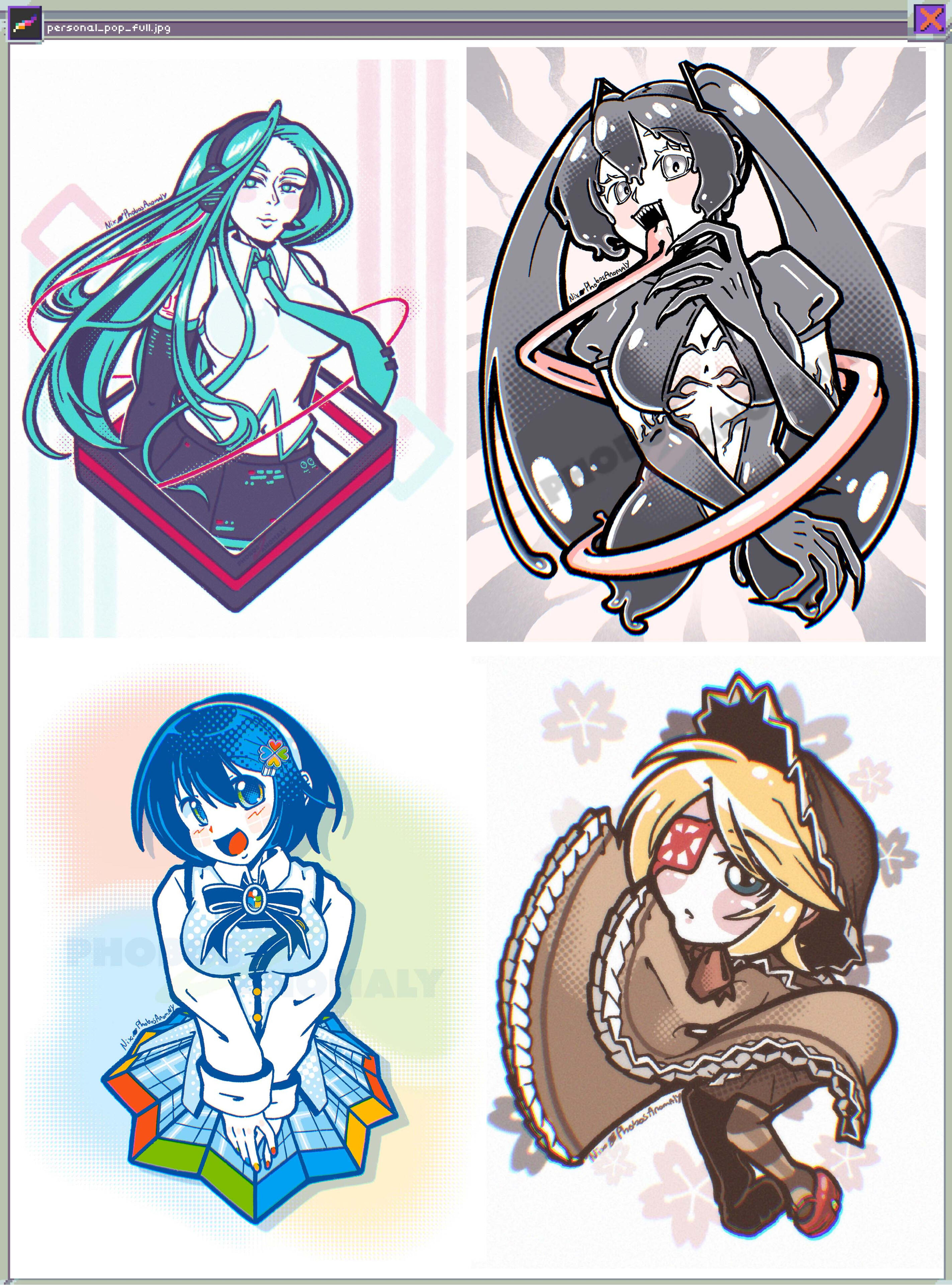 POP-style bust ups are very stylised, with the subject's body cut off somewhere beneath the bust, usually to accentuate shapes or bring focus to certain aspects. Full body chibis also fall under this category.