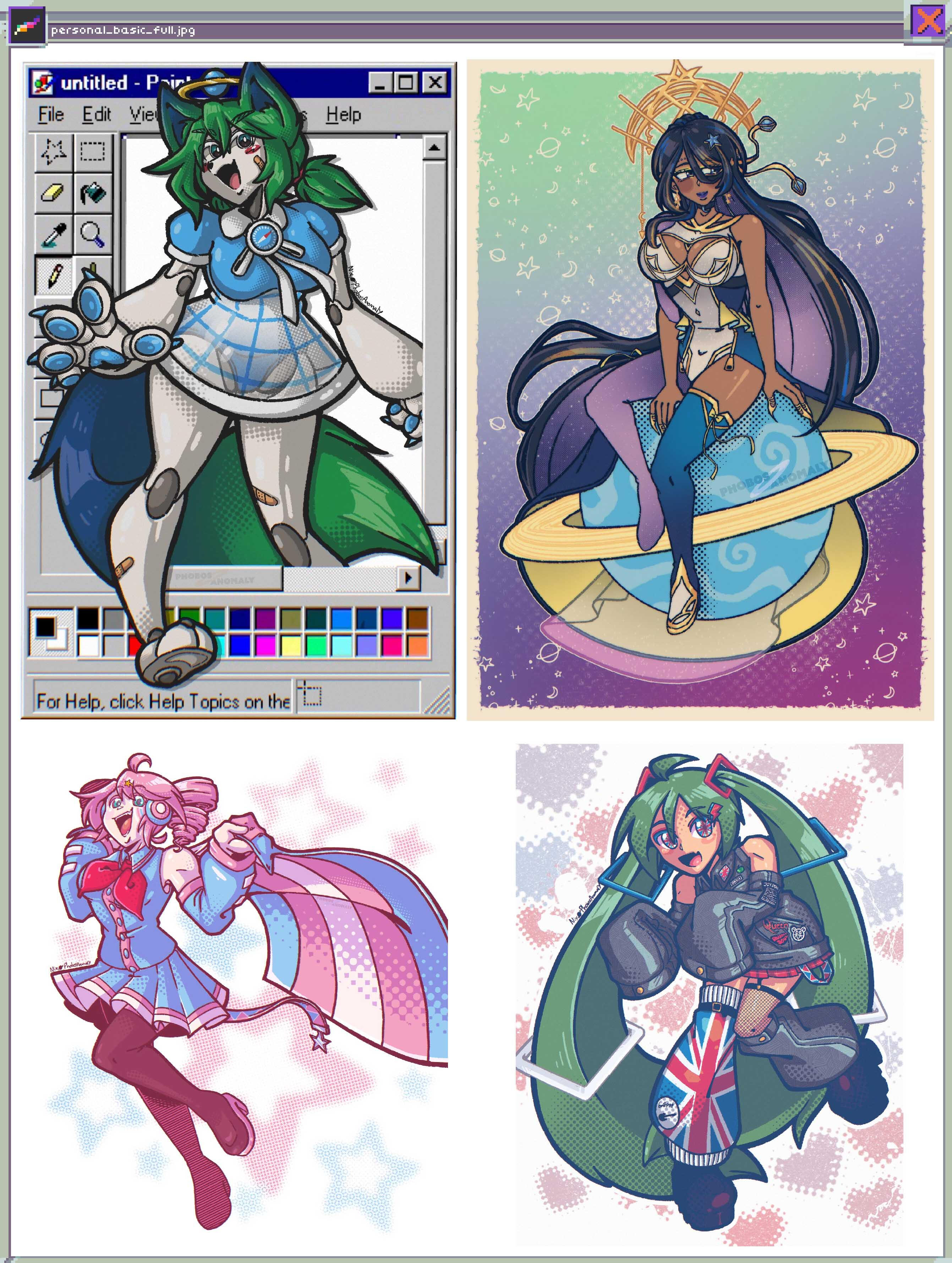 Currently, this style is not available for commission work.Illustrations on an A5 canvas with basic shading, usually paired with a very simplistic, gradient or patterned background with heavy reliance on adjustment layers for a somewhat retro effect.Available as portrait, landscape or icons.